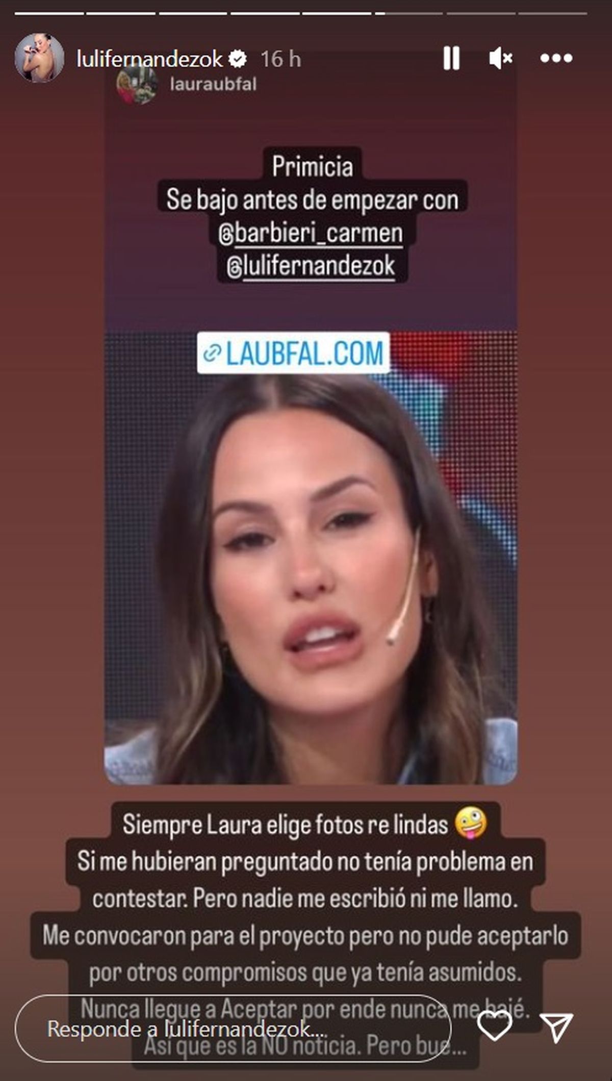 "Es todo mentira (lo que se decía de los motivos por los cuales no aceptó el ofrecimiento). Ayer lo aclaré en mis historias. Me propusieron pero no pude aceptar porque tengo laburos ya aceptados", precisó Luli.