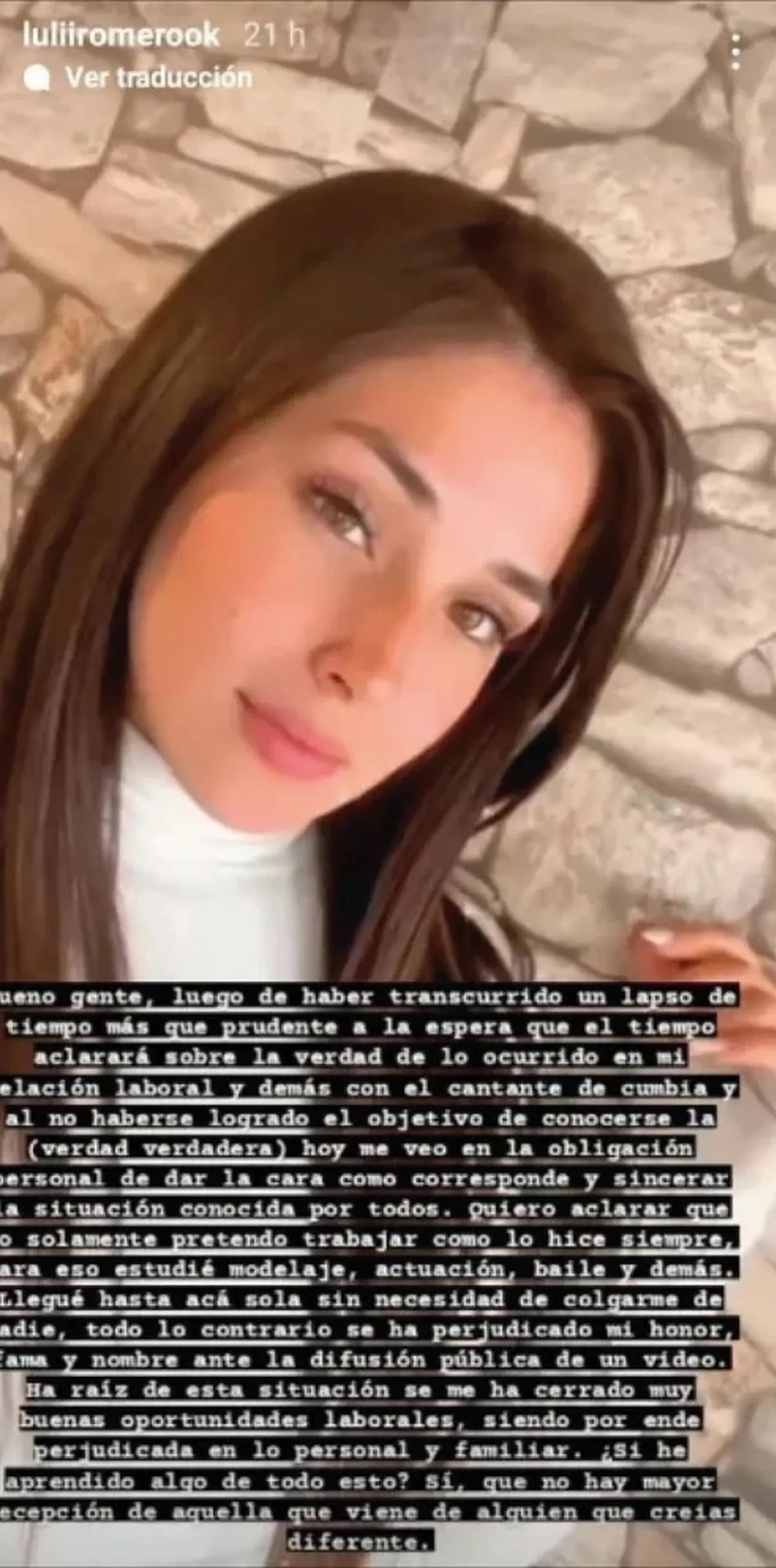 “Luego de haber transcurrido un lapso de tiempo más que prudente a la espera que el tiempo aclarara la verdad de lo ocurrido en mi relación laboral y demás con el cantante de cumbia, y al no haberse logrado el objetivo de conocerse la verdadera verdad, hoy me veo obligada a dar la cara como corresponde y sincerar la situación”, expresó la bailarina Luli Romero en su cuenta de Instagram.