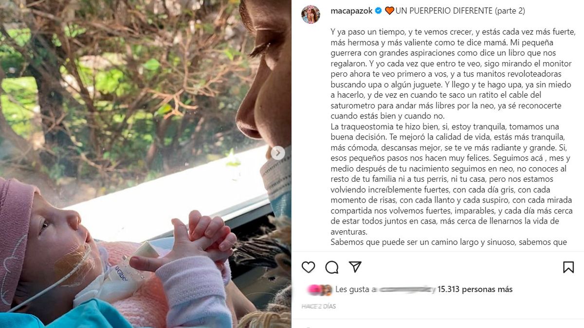 “Abril tiene un síndrome genético (no digo cuál es porque aún no quiero recibir información extra oficial de alguien que googlee). Es un síndrome que no se podría haber visto en el embarazo. Y trae consigo varias patologías asociadas. Una de ellas es la dificultad de tragar y deglutir. Eso le genera dificultad para respirar”, explicó Macarena Paz desde sus historias de Instagram.