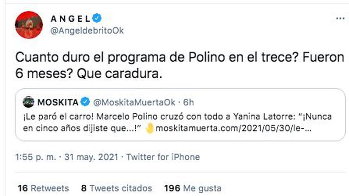 En su Twitter, Ángel de Brito puso más pimienta a la contienda entre Yanina y Marcelo Polino. “¿Cuánto duró el programa de Marcelo Polino en El trece? ¿Fueron 6 meses? ¡Que caradura!”, exclamó el periodista.