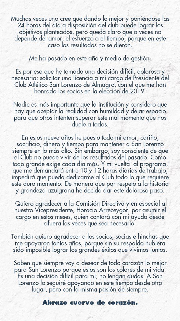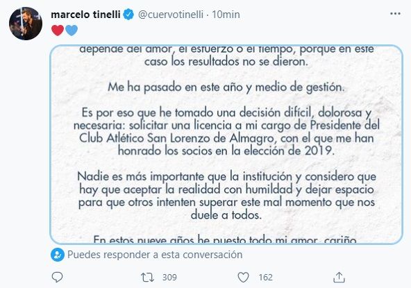 "Saben que siempre voy a desear de todo corazón lo mejor para San Lorenzo porque estos son los colores de mi vida. Es una decisión difícil para mí, no tengan dudas. A San Lorenzo lo seguiré apoyando en este tiempo desde otro lugar, pero con la misma pasión de siempre. Abrazo cuervo de corazón", finalizó Marcelo.