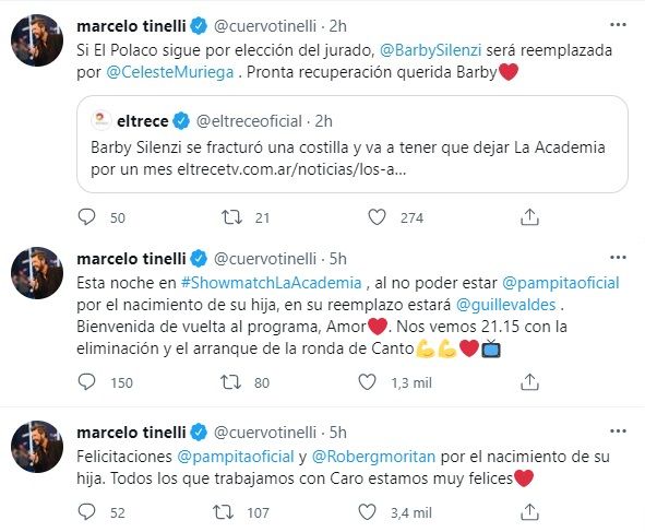"Si El Polaco sigue por elección del jurado, @BarbySilenzi será reemplazada por @CelesteMuriega. Pronta recuperación querida Barby", expresó.