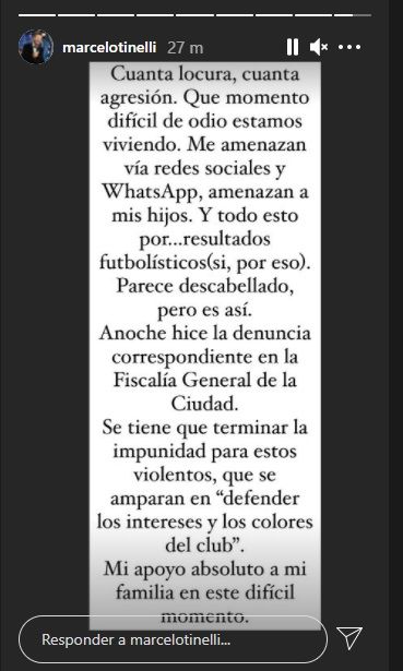 "Cuánta locura, cuánta agresión. Qué momento difícil de odio estamos viviendo. Me amenazan vía redes sociales y WhatsApp, amenazan a mis hijos. Y todo esto por resultados futbolísticos (sí, por eso). Parece descabellado, pero es así", expresó Tinelli en sus historias de Instagram.