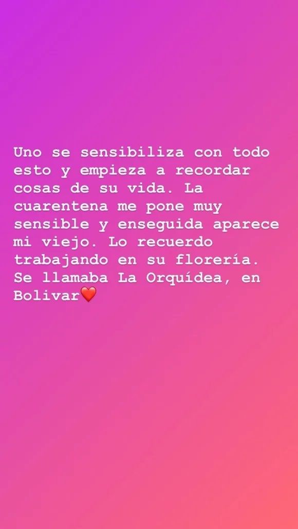 “Uno se sensibiliza con todo esto y empieza a recordar cosas de su vida. La cuarentena me pone muy sensible y enseguida aparece mi viejo. Lo recuerdo trabajando en su florería. Se llamaba La Orquídea, en Bolivar“, escribió en una story de Instagram sobre su padre, Dino Hugo Tinelli.