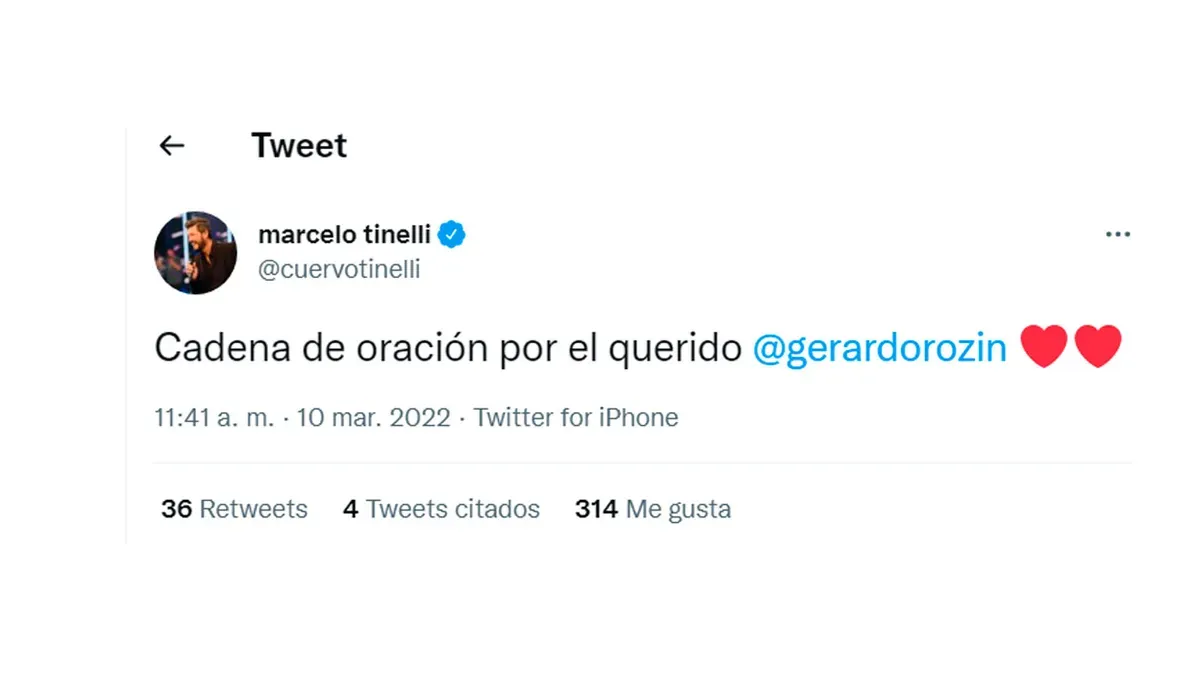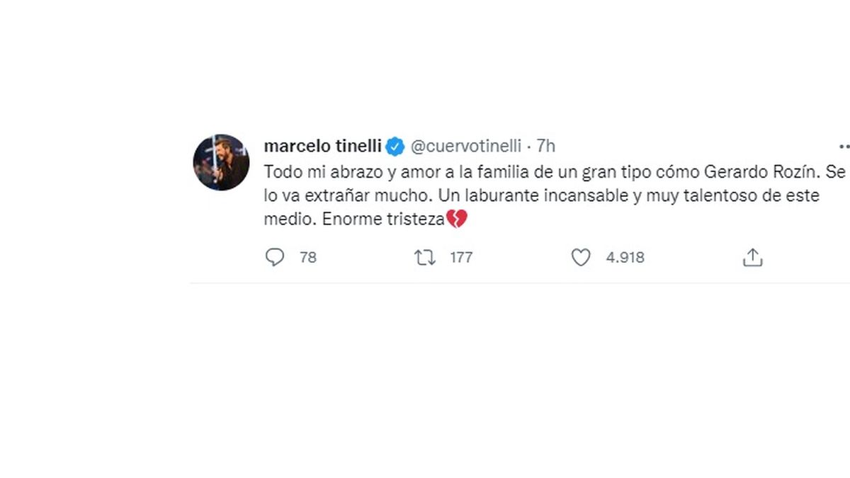 "Todo mi abrazo y amor a la familia de un gran tipo cómo Gerardo Rozín. Se lo va extrañar mucho. Un laburante incansable y muy talentoso de este medio. Enorme tristeza", indicó Marcelo Tinelli con el emoji de un corazón roto.