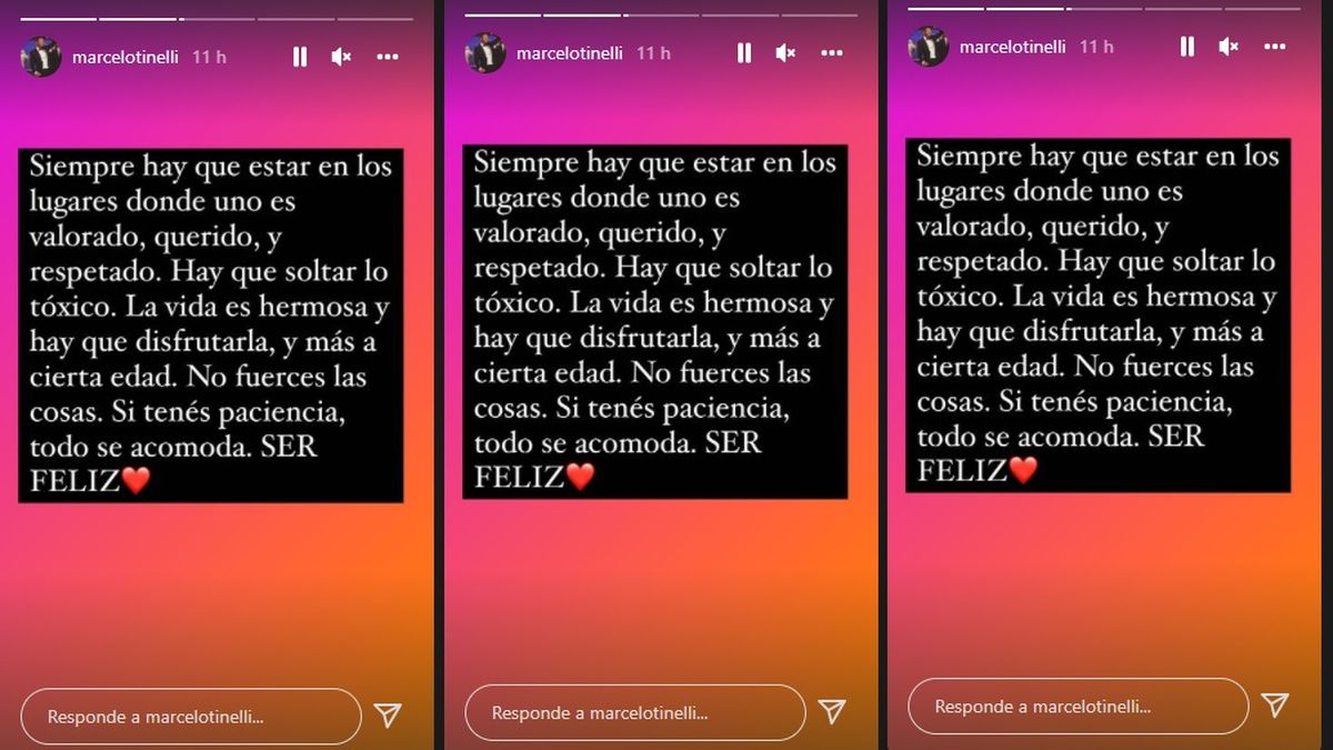 En la tarde del viernes, el conductor Marcelo Tinelli compartió una profunda reflexión desde sus historias de Instagram: "Siempre hay que estar en los lugares donde uno es valorado, querido y respetado", comenzó.