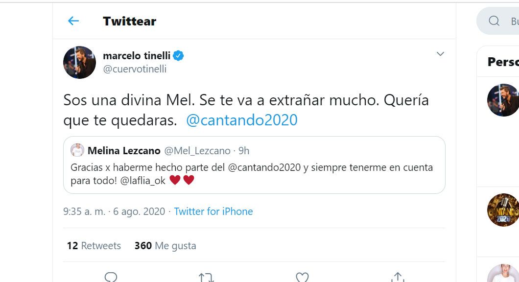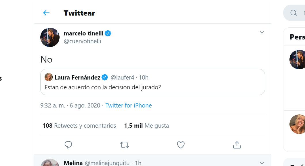 "¿Estan de acuerdo con la decisión del jurado?": preguntó Laurita Fernández desde su cuenta de Twitter y Marcelo respondió con un rotundo "No".