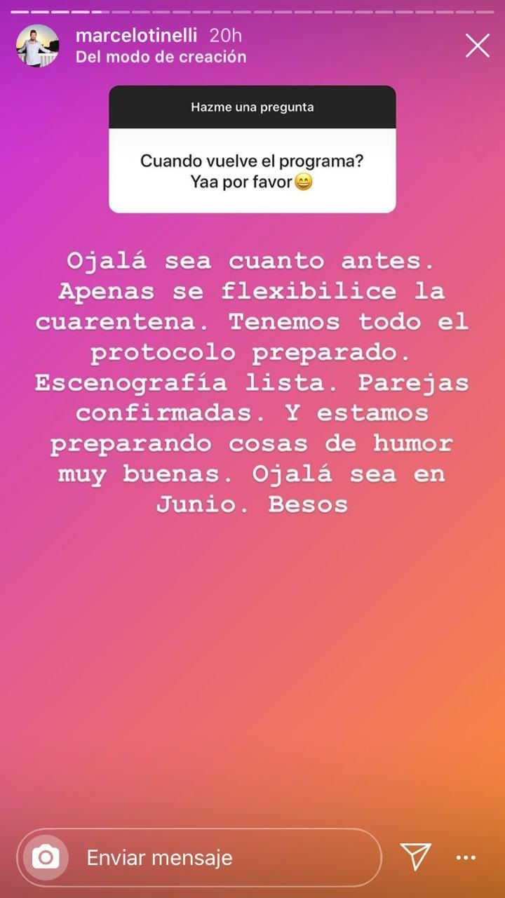 Sobre la fecha de regreso, dijo: "Ojalá sea cuanto antes. Apenas se flexibilice la cuarentena. Tenemos todo el protocolo preparado. Escenografía lista. Parejas confirmadas. Ojalá sea en junio".