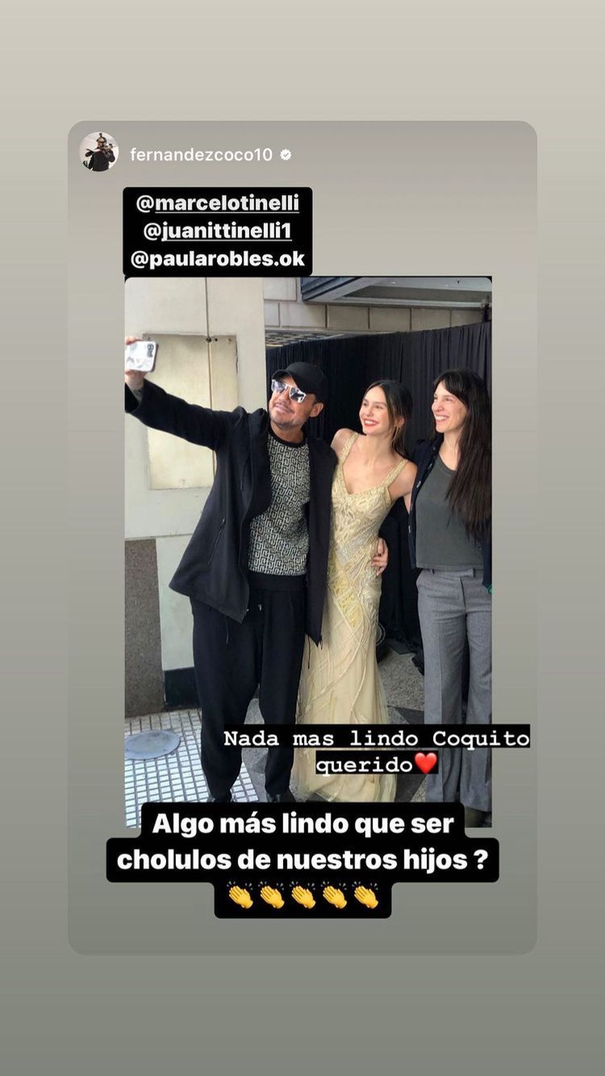 Tinelli reposteó la storie de Coco Fernández, Gerente de Producción de El Trece, que le dedicó unas tiernas palabras: "Hay algo más lindo que ser cholulos de nuestros hijos?", le dijo, a lo que el conductor respondió, "Nada más lindo Coquito".