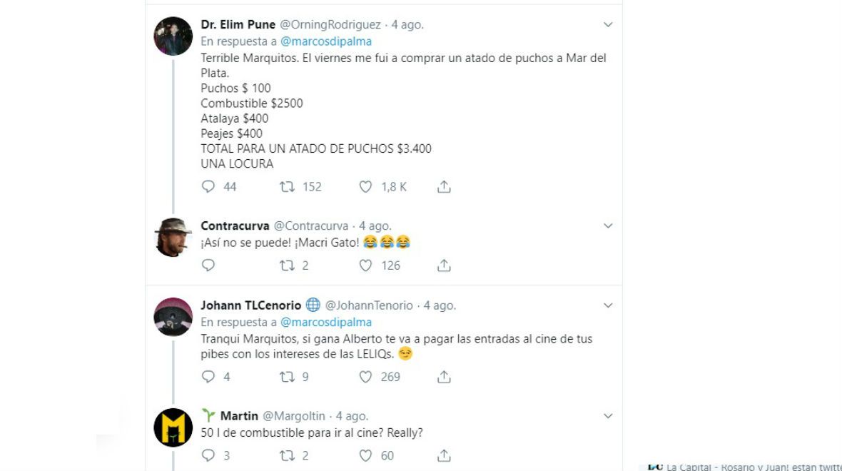 Este mensaje fue castigado por sus seguidores ya que en los detalles de sus gastos Di Palma exhibe la carga de combustible y peajes, por lo que hizo una distancia muy amplia para ir a un cine.