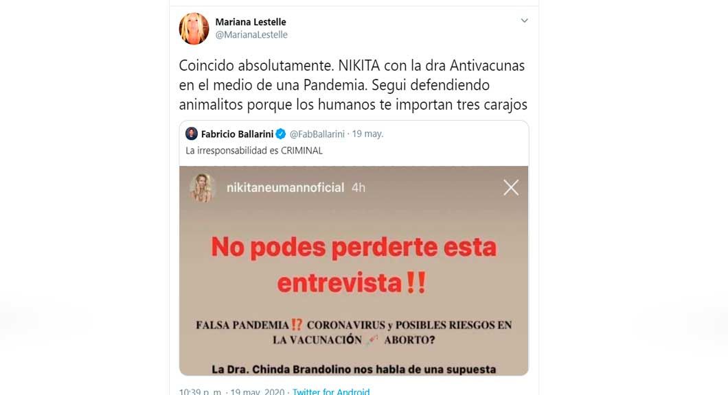 Además, desde su redes ironizó con el cuidado de Nicole por los animales: “Coincido absolutamente. NIKITA con la dra Antivacunas en el medio de una Pandemia. Segui defendiendo animalitos porque los humanos te importan tres carajos”.