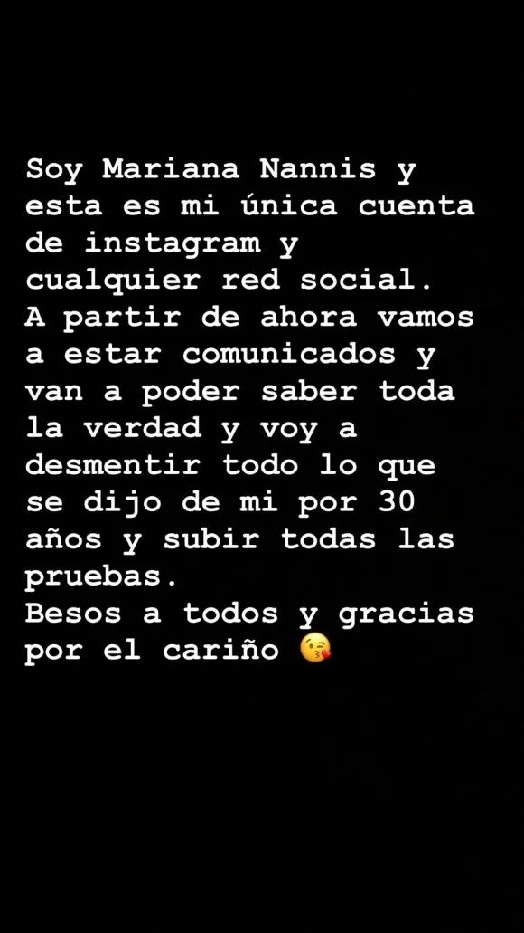 Para finalizar, Mariana contó el motivo por el cual decidió sumarse al mundo de las redes: "Soy Mariana Nannis y esta es mi única cuenta de Instagram y cualquier red social. A partir de ahora vamos a estar comunicados y van a poder saber toda la verdad. Y voy a desmentir todo lo que se dijo de mí por 30 años, y subir todas las pruebas. Besos a todos y gracias por el cariño”.