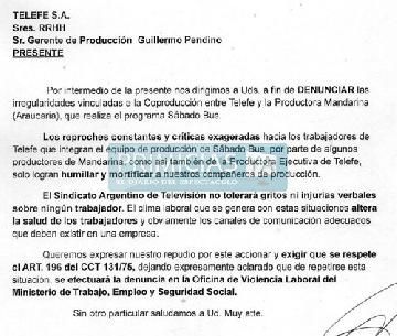¿Pudiste leer el comunicado que envió la Comisión Interna de Telefe sobre los productores de Sábado bus?En realidad no es una denuncia contra nosotros, Mandarina, es más, creo que hoy sale un nuevo comunicado para desmentir y sacar a Mandarina de la acusación porque productores nuestros sólo hay dos trabajando en el programa. Los productores son todos de Telefe.
