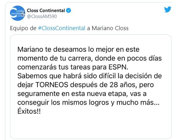 "Mariano te deseamos lo mejor en este momento de tu carrera, donde en pocos días comenzarás tus tareas en ESPN", se indicó en el mensaje.