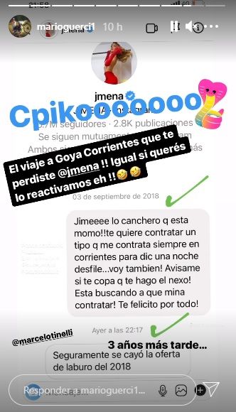 "¡Jimeee lo canchero que está Momo! Te quiere contratar un tipo que me contrata siempre en Corrientes para diciembre, una noche de desfile. Voy también. Avisame si te copa y te hago el nexo. Está buscando a una mina para contratar. ¡Te felicito por todo!", le escribió Mario Guerci con buena onda el 3 de septiembre de 2018.