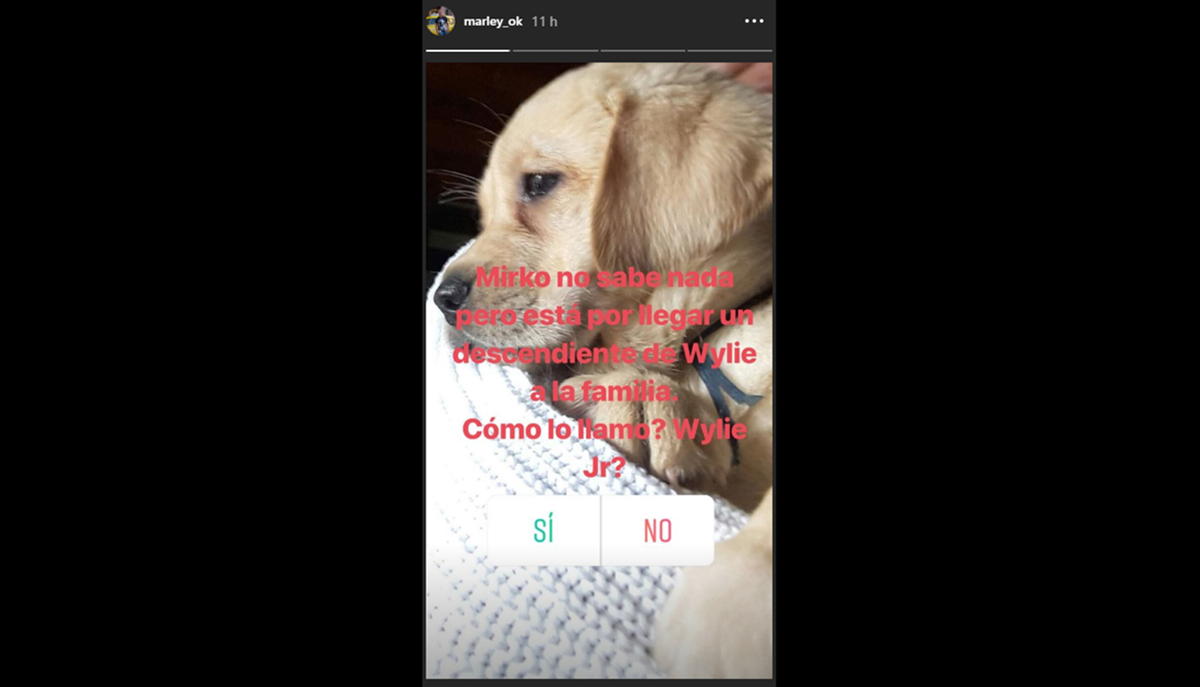 "Mirko no sabe nada pero está por llegar un descendiente de Wylie a la familia. Cómo lo llamo? Wylie Jr?", le contó a sus fans, al tiempo que les pidió que votaran por "sí" o por "no" al hecho de llamar al cachorro igual que su mascota fallecida en 2016.