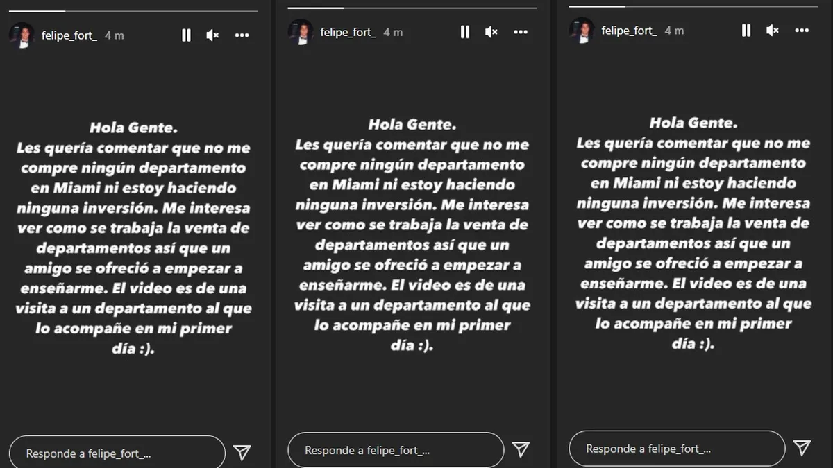 "Hola Gente. Les quería comentar que no me compré ningún departamento en Miami, ni estoy haciendo ninguna inversión", explicó el joven desde Instagram.