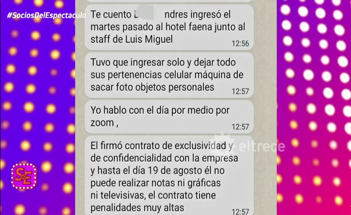“Yo hablo con el día por medio por Zoom. Él firmó un contrato de exclusividad y de confidencialidad con la empresa hasta el 19 de agosto, fecha en la que se va de Argentina Luis Miguel para cumplir con sus presentaciones”, continuó dejando en claro un accionar sospechoso.