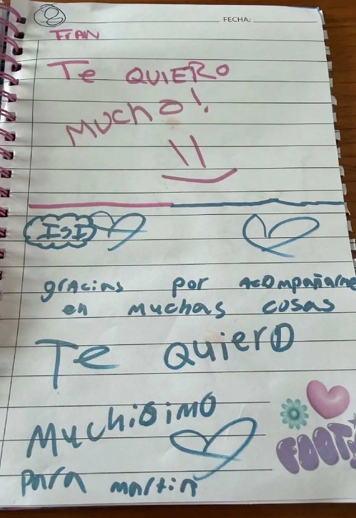 "Para Martín de Fran e Isi", se observó en la dedicatoria de una carta que le escribieron de puño y letra las pequeñas al empresario, reflejando el afecto que le tienen. "Cómo nos conocimos", decía la hoja con el dibujo de un corazón.