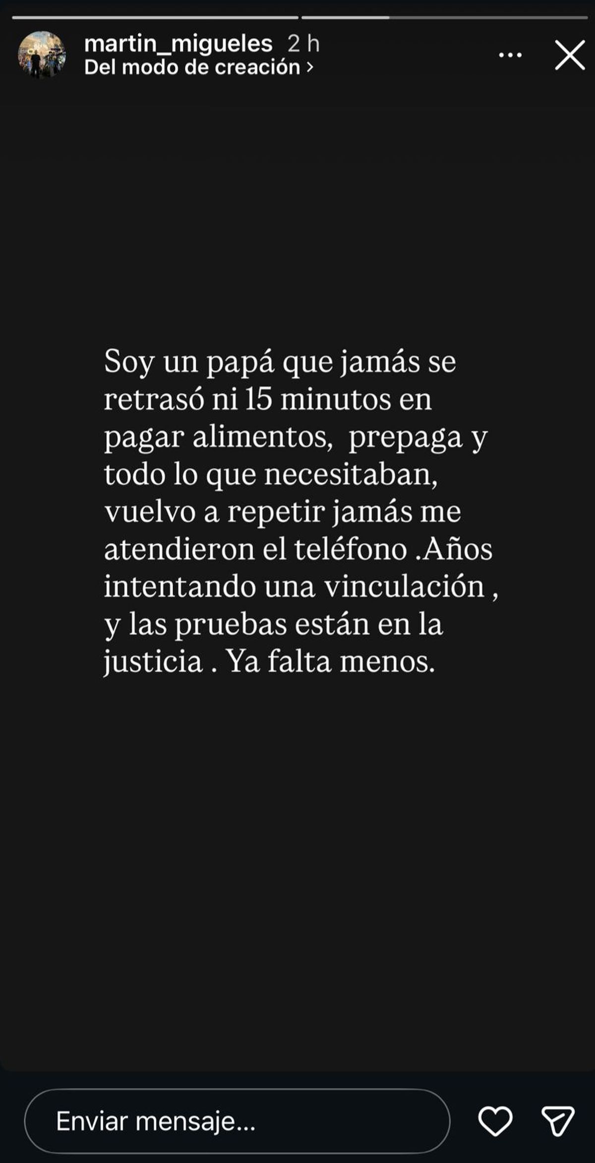 Migueles también explicó que, según su versión, el conflicto con la madre del niño impidió cualquier tipo de vínculo. “Hemos intentado con mi familia conocer a mi hijo y jamás contestaron los mensajes, ni de mi hija, madre, padre y hermanas, menos los míos”, aseguró. Y agregó: “Llamé por teléfono y me demandaron por hostigamiento. Decidimos ir por la Justicia y ahí estamos, esperando la mediación con toda mi familia”.