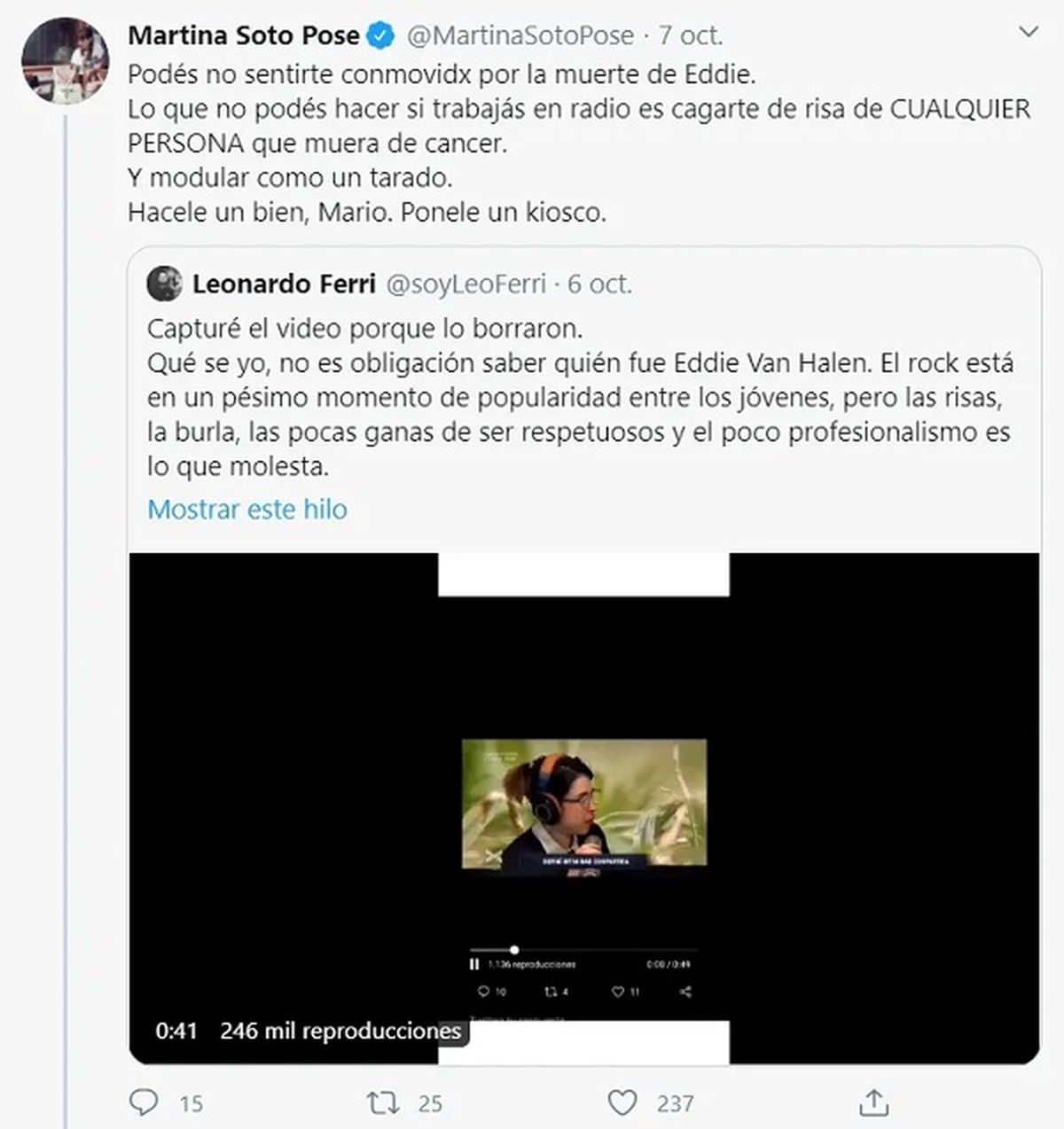 "Podés no sentirte conmovidx por la muerte de Eddie. Lo que no podés hacer si trabajás en radio es cagarte de risa de CUALQUIER PERSONA que muera de cáncer. Y modular como un tarado. Hacele un bien, Mario. Ponele un kiosco", escribió.