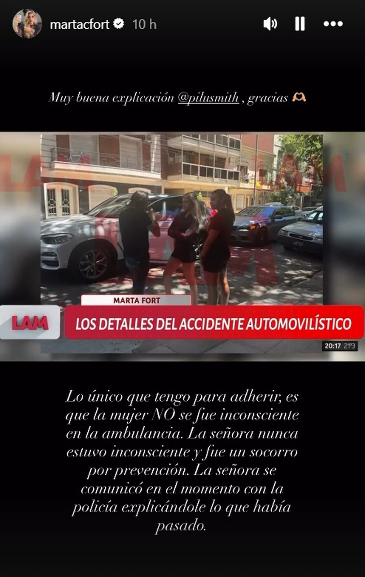 Asimismo, llevó tranquilidad sobre el estado de Martita Fort al confirmar que está bien, así como también que tampoco quedó demorada. Y señaló que "como en todo accidente de tránsito donde está vinculada a una persona, seguramente se labrarán las actuaciones correspondientes".
