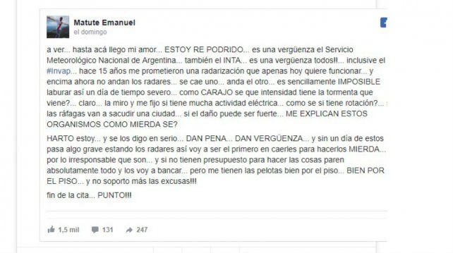 Matías Bertolotti hizo un fuerte descargo desde Facebook quejándose del mal funcionamiento de los radares climáticos en el sitio del Servicio Meteorológico Nacional.
