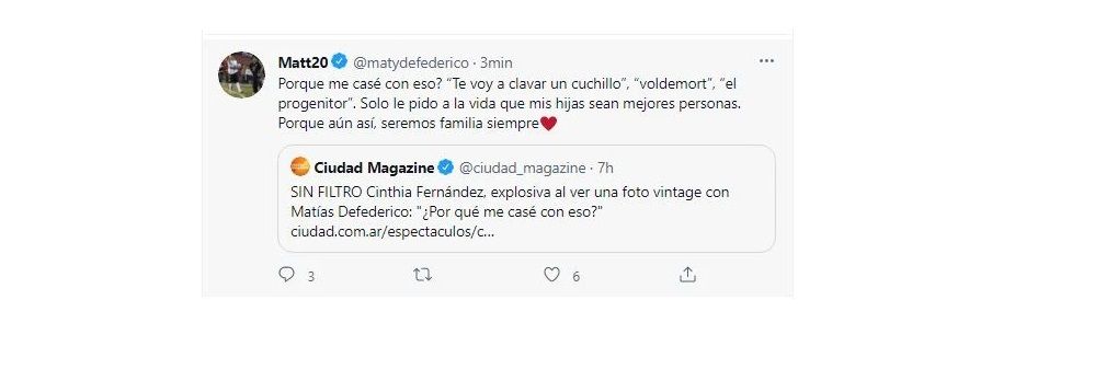 Al ver este comentario al aire de la madre de sus hijas, Matías Defederico comentó fuerte vía Twitter: “¿Por que me casé con eso? “Te voy a clavar un cuchillo”, “voldemort”, “el progenitor”. Solo le pido a la vida que mis hijas sean mejores personas. Porque aún así, seremos familia siempre”.