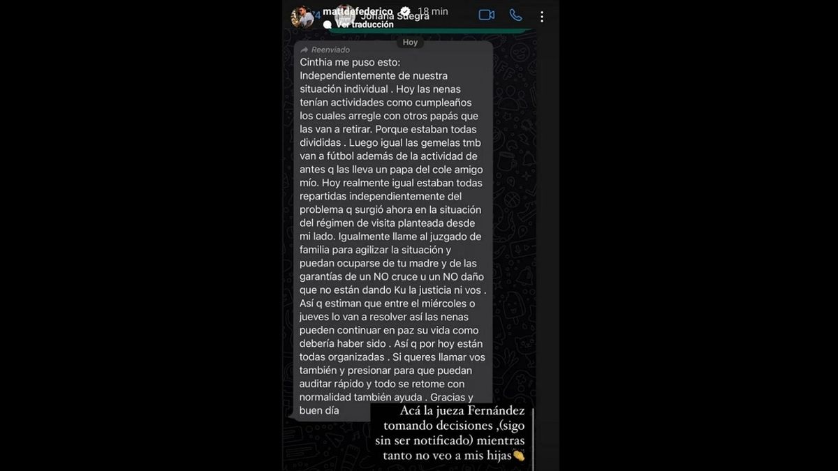 "Llamé al juzgado de familia para agilizar la situación y puedan ocuparse de las garantías de un no cruce, de un no daño, que no están dando la Justicia ni vos. Así que estiman que entre el miércoles o jueves lo van a resolver, así las nenas pueden continuar en paz con su vida", explicaba Cinthia en ese mensaje a través de su madre.