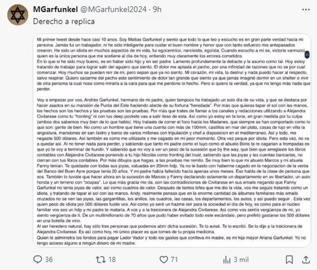 En ese mensaje grabado, Garfunkel señala: “Hola. Soy Matías Garfunkel, yo creé la cuenta @MGarfunkel2024 con el sólo objetivo de poder publicar mi derecho a réplica, esta carta”.
