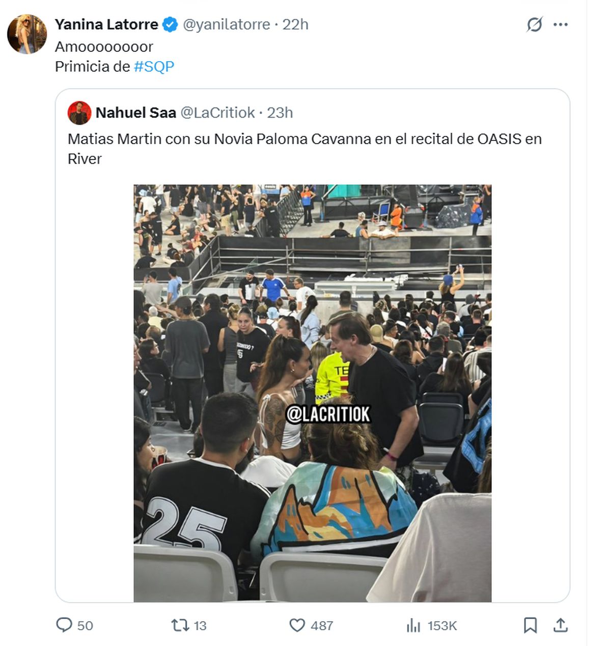 Además, Yanina compartió la foto publicada por el periodista Nahuel Saa, donde se ve a Cavanna y Martín juntos en el recital de Oasis, confirmando así la nueva etapa sentimental del conductor.