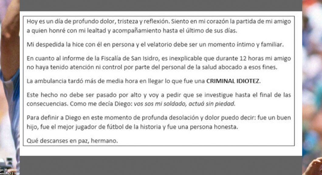 “Es inexplicable que durante doce horas mi amigo no haya tenido atención ni control por parte del personal de salud abogado a esos fines”, dijo y definió como una “criminal idiotez” el hecho de que la ambulancia tardara media hora en llegar a la casa del barrio privado de Tigre donde Maradona se recuperaba de la operación en la cabeza, por pedido de sus hijas.