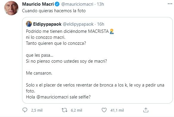 Curiosamente, horas después el cantante obtuvo la respuesta del propio ex presidente: "Cuando quieras hacemos la foto", contestó buena onda.