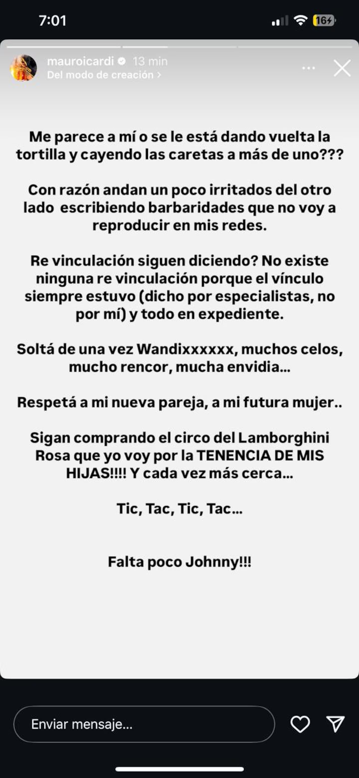 “Soltá de una vez Wandixxxxxx, muchos celos, mucho rencor, mucha envidia...Respetá a mi nueva pareja, a mí futura mujer.. Sigan comprando el circo del Lamborghini rosa que yo voy por la ¡¡¡TENENCIA DE MIS HIJAS!!!! Y cada vez más cerca...“, agregó. Y cerró con una referencia a Johnny Depp: “¡¡¡Tic, Tac, Tic, Tac...Falta poco Johnny!!!“.