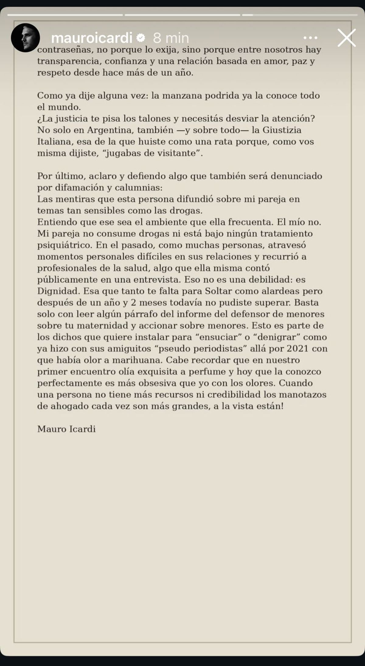 Icardi, además, cerró el posteo anunciando que denunciará a Wanda por difamación y calumnias. "Las mentiras que esta persona difundió sobre mi pareja en temas tan sensibles como las drogas. Entiendo que ese sea el ambiente que ella frecuenta. El mío no", aseguró.