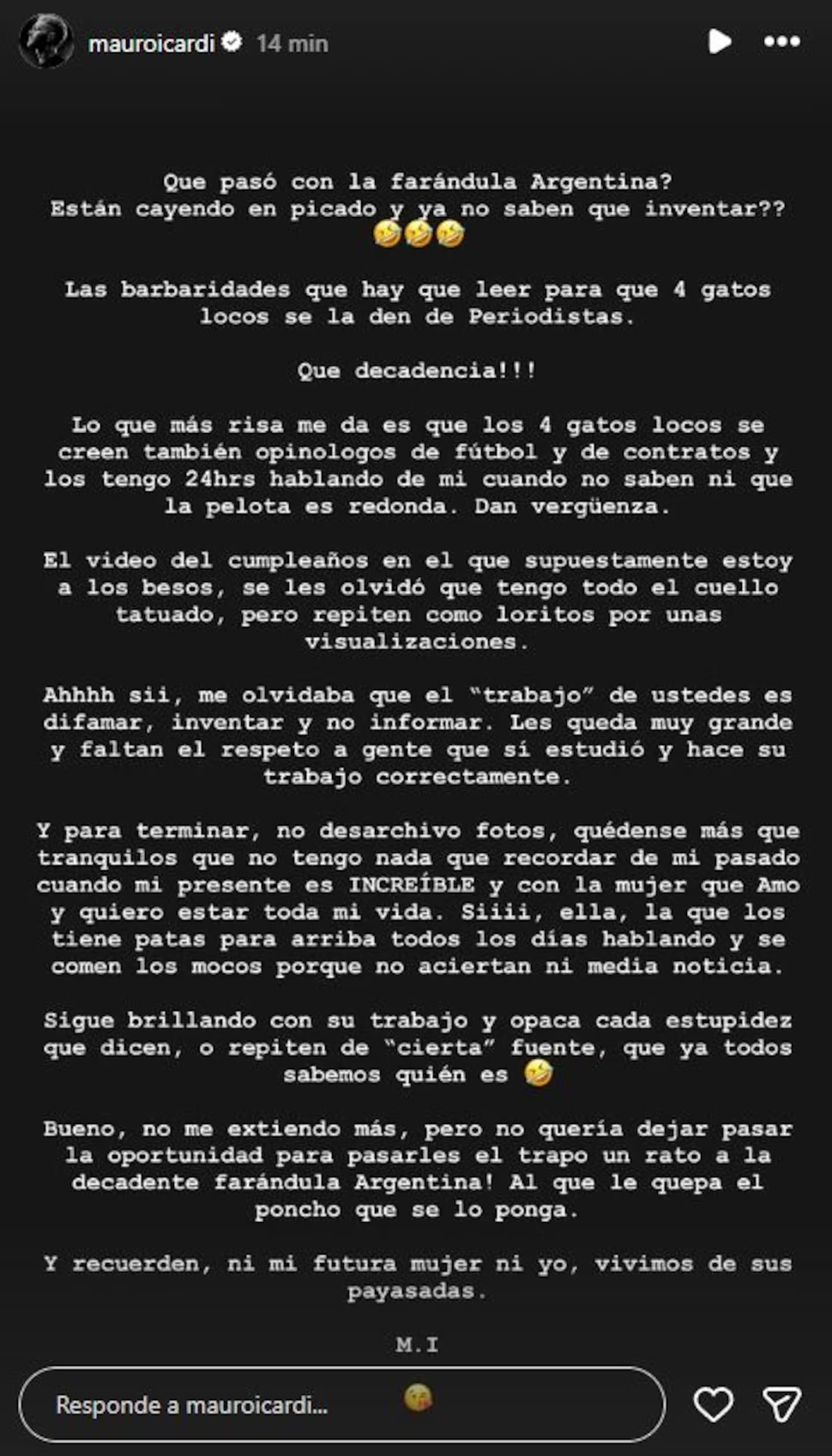 A través de un fuerte descargo en sus historias de Instagram, el delantero no se guardó nada y apuntó directo contra los periodistas y algunos medios argentinos. Con evidente bronca, disparó: “¿Qué pasó con la farándula argentina? ¿Están cayendo en picado y ya no saben qué inventar?”.