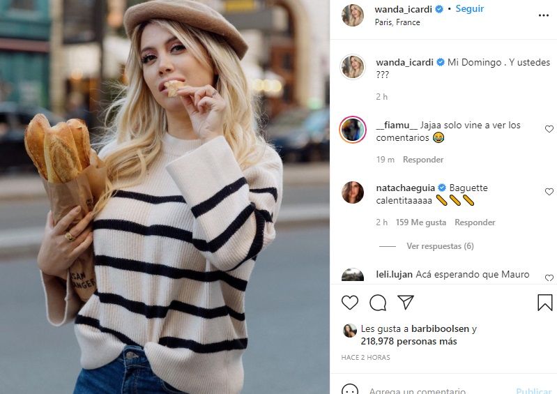 En tanto, Wanda compartió una foto de su domingo: "Mi domingo. Y ustedes?", le consultó la rubia a sus seguidores con una foto de ella comiendo una baguette de pan.