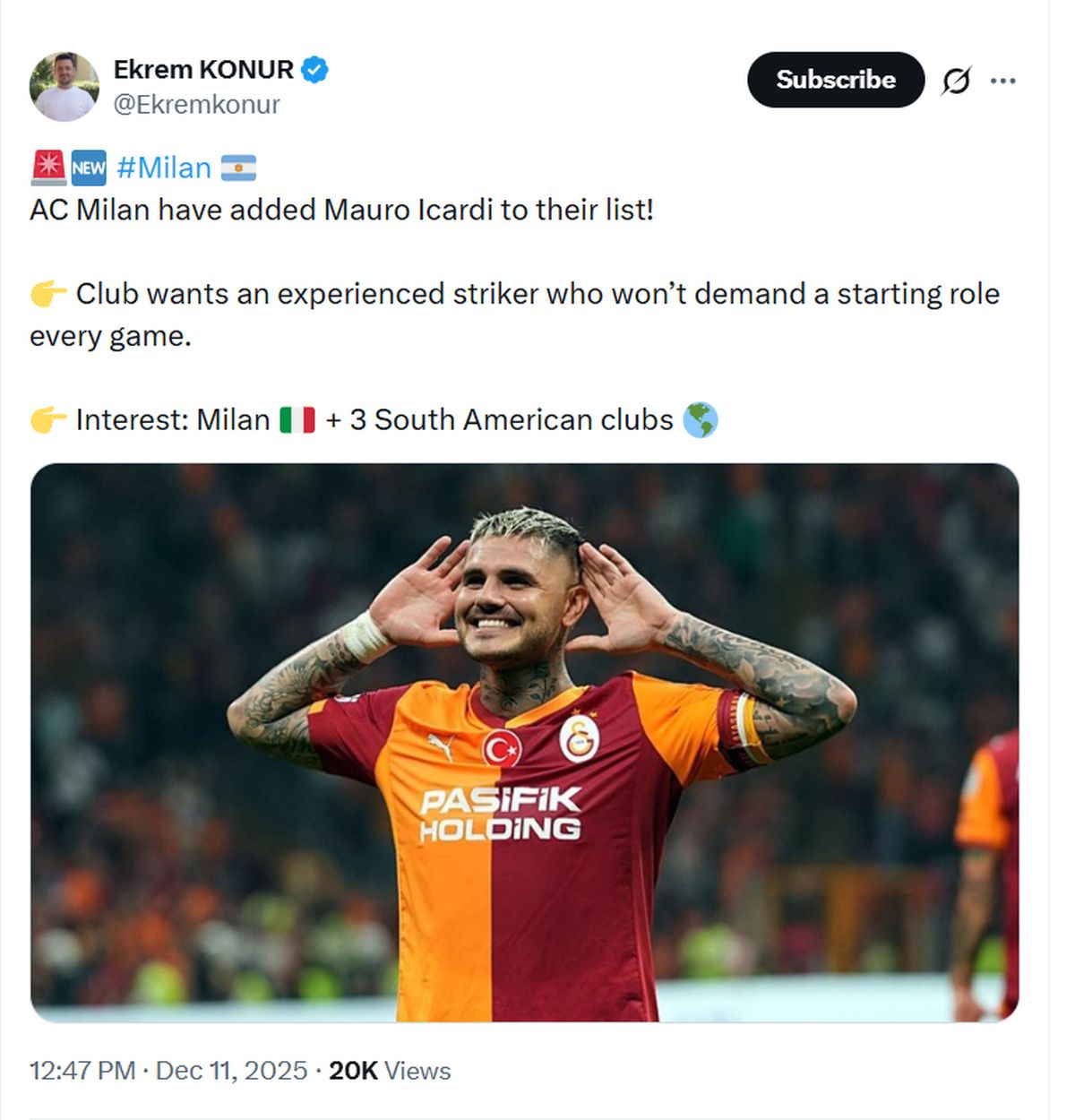 Eel periodista Ekrem Konur informó a través de sus redes sociales: "¡El AC Milan agregó a Mauro Icardi a su lista! El club busca un delantero experimentado que no sea titular en todos los partidos".