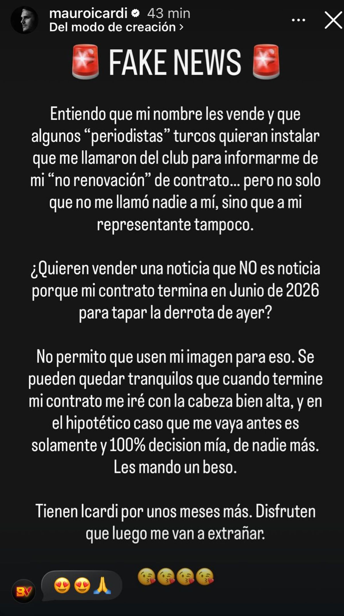 En otro tramo de su descargo, Icardi precisó cuál es la vigencia de su contrato y cuestionó el trasfondo de las noticias que aparecieron justo después de una derrota del equipo: "¿Quieren vender una noticia que no es noticia —porque mi contrato termina en junio de 2026— para tapar la derrota de ayer?".