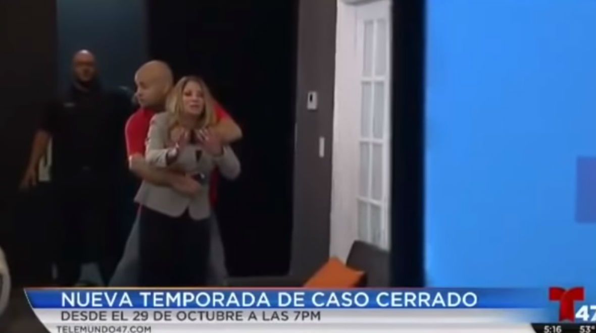Personal de seguridad del estudio tuvo que ingresar y el momento de tensión durante varios minutos. El hombre tomó del cuello a la animadora y no la soltaba.