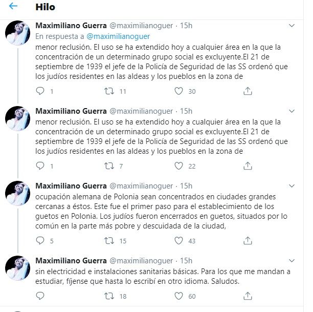 Ante los comentarios que recibió, Guerra comentó a qué refiere el término de Ghetto: "Un gueto (del italiano ghetto) es un área separada para la vivienda de un determinado grupo étnico, cultural o religioso, voluntaria o involuntariamente, en mayor o menor reclusión".