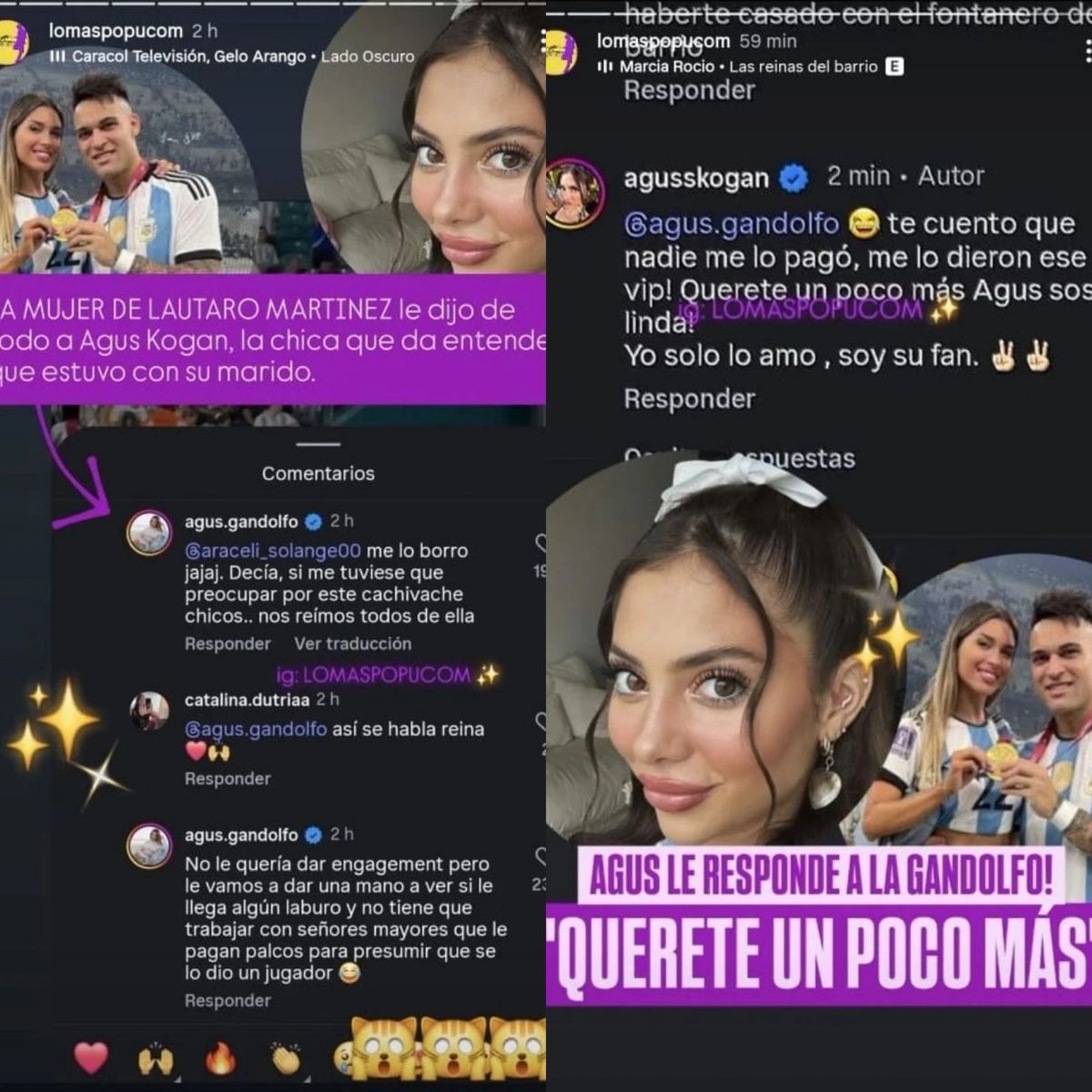 Agustina Gandolfo no dudó en arremeter contra Kogan, escribiendo en un comentario sobre las controvertidas imágenes: "Si me tuviese que preocupar por este cachivache chicos... nos reímos todos de ella". Luego agregó: "No le quería dar engagement, pero le vamos a dar una mano a ver si le llega algún laburo y no tiene que trabajar con señores mayores que le pagan palcos para presumir que se lo dio un jugador".