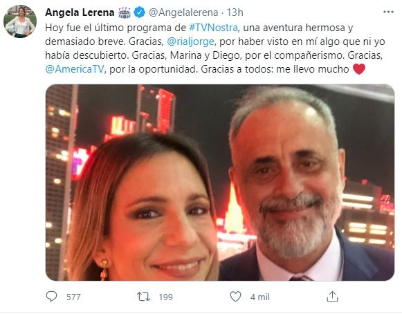 Minutos después del último programa, Ángela Lerena compartió una foto junto al conductor en Twitter y se despidió también del ciclo: "Hoy fue el último programa de #TVNostra, una aventura hermosa y demasiado breve. Gracias, @rialjorge , por haber visto en mí algo que ni yo había descubierto. Gracias, Marina y Diego, por el compañerismo. Gracias, @AmericaTV , por la oportunidad. Gracias a todos: me llevo mucho".