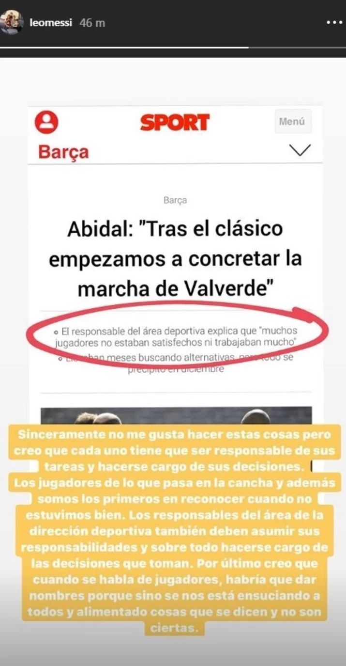 Ante esto, Messi respondió como nunca a través de Instagram Stories sobre el tema: “Sinceramente no me gusta hacer estas cosas, pero creo que cada uno tiene que ser responsable de sus tareas y hacerse cargo de sus decisiones. Los jugadores de lo que pasa en la cancha y, además, somos los primeros en reconocer cuando no estuvimos bien".