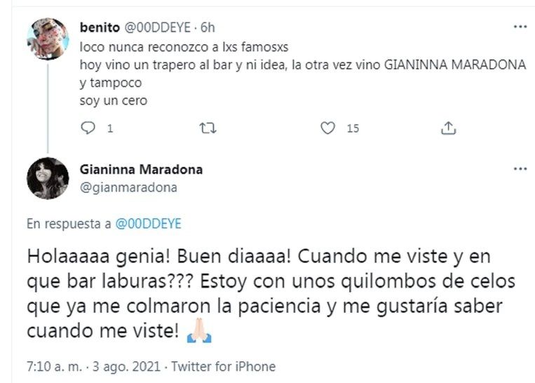 “Hola, genia. Buen día. ¿Cuándo me viste y en qué laburas?¡Estoy con unos quilombos de celos que ya me colmaron la paciencia y me gustaría saber cuándo me viste!", sentenció la hermana de Dalma.