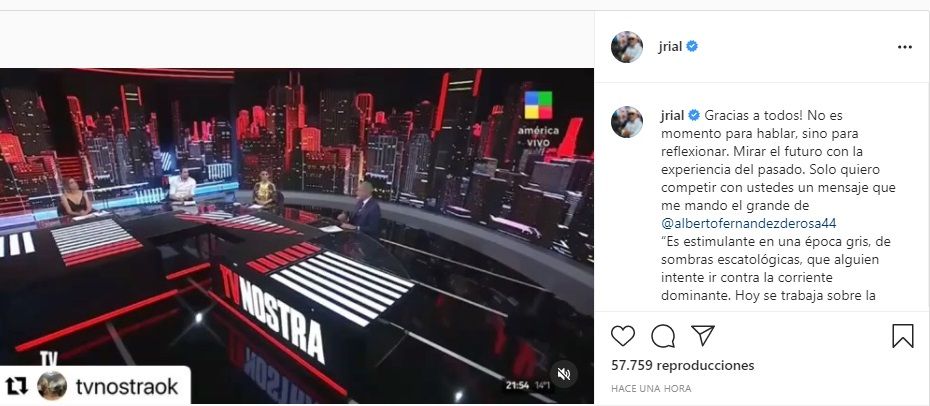 "Gracias a todos! No es momento para hablar, sino para reflexionar. Mirar el futuro con la experiencia del pasado. Solo quiero competir con ustedes un mensaje que me mando el grande de @albertofernandezderosa44", comenzó Rial, para dar paso la texto que le envió el actor.