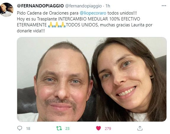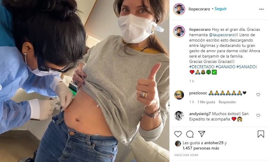 "Hoy es el gran día. Gracias hermanita @laupecoraro!!! Lleno de emoción escribo esto descargando entre lágrimas y destacando tu gran gesto de amor para darme vida! Ahora seré el Benjamín de la familia. Gracias Gracias Gracias!!! #DECRETADO #GANADO #SANADO!", precisó movilizado.