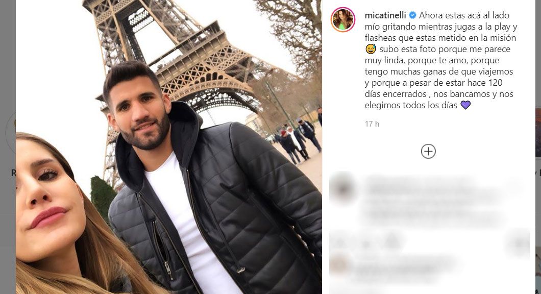 “Ahora estás acá al lado mío gritando mientras jugas a la play y flasheas que estas metido en la misión. Subo esta foto (de ellos juntos en París) porque me parece muy linda, porque te amo, porque tengo muchas ganas de que viajemos y porque a pesar de estar hace 120 días encerrados , nos bancamos y nos elegimos todos los días”, indicó.