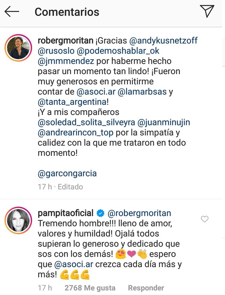 “¡@robergmoritan tremendo hombre! ¡Lleno de amor, valores y humildad! ¡Ojalá todos supieran lo generoso y dedicado que sos con los demás! ¡Espero que @asoci.ar crezca cada día más y más!”, expresó la modelo y conductora en la red social.
