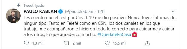 Al confirmarse el resultado de su análisis, Paulo expresó desde Twitter: "Les cuento que el test por Covid-19 me dio positivo. Nunca tuve síntomas de ningún tipo".